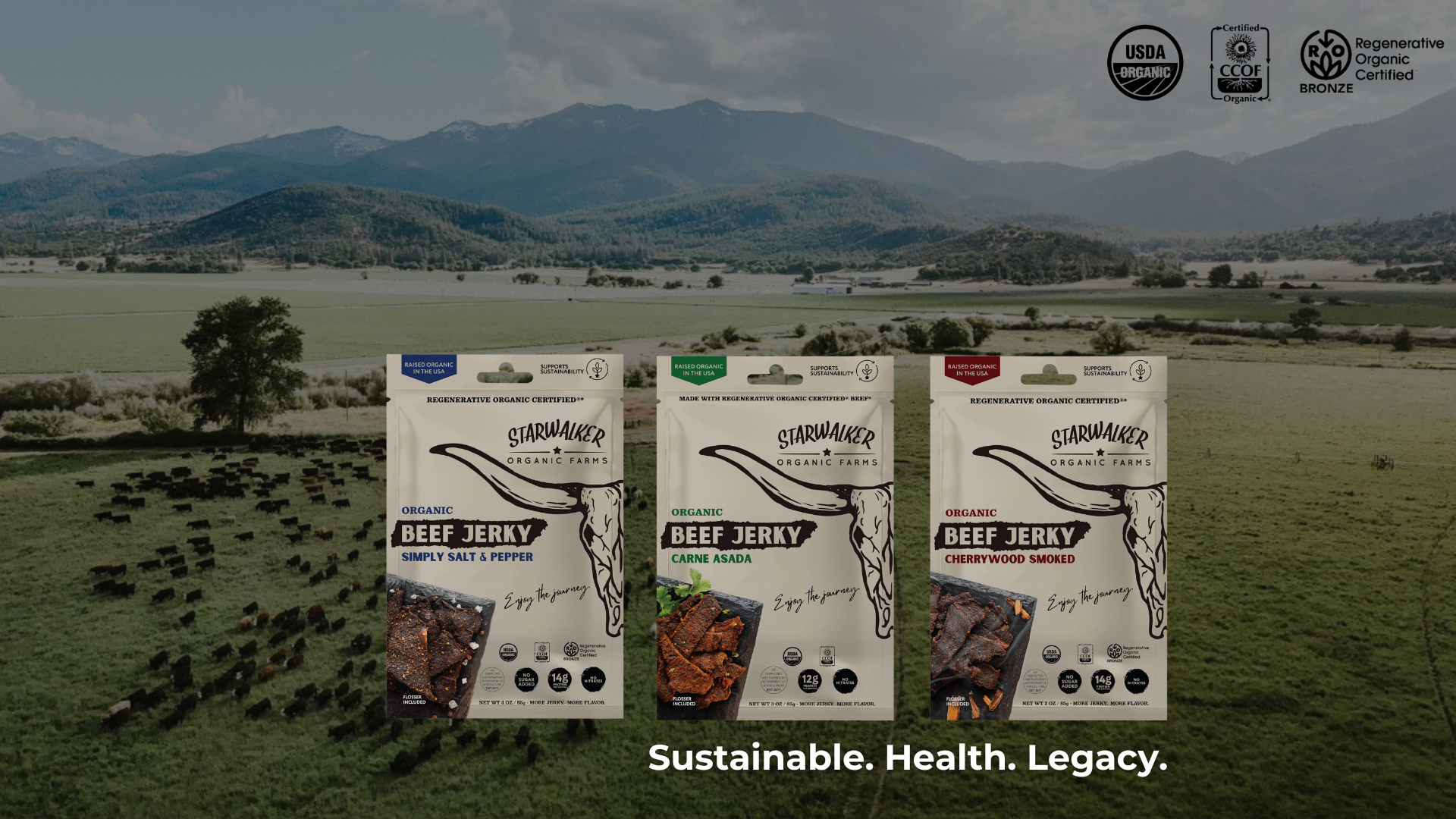 StarWalker Organic Farms now offers premium beef jerky, made from our certified organic, grass-fed, grass-finished beef. Soon, we’ll also be introducing pork jerky and bacon jerky, all crafted with the same dedication to quality and sustainability. With no-sugar options and the first Regenerative Organic Certified® jerky, our products deliver a clean, nutritious, and delicious snack you can trust.